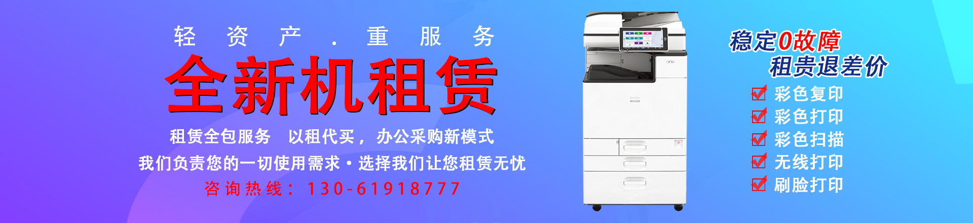 很多企業(yè)用戶在自己購買復印機,還是租賃復印機的時候,顯得搖擺不定。那兩者間到底有什么區(qū)別?上海宇川作為上海復印機租服務商。由我們?yōu)榇蠹以敿氈v解兩者間的區(qū)別。1、辦公耗材:購買復印機后,還需要購買其他配套產(chǎn)品,另外還要自學如何更換耗材和維護機器。租賃復印機除了打印用紙以外,其他耗材均由復印機服務商來定期更換。2、技術員上門服務:購買復印機后,如果出現(xiàn)問題,需要聯(lián)系專門的售后,但是這類的售后都是有償上門服務。租賃復印機由專業(yè)的售后團隊免費上門服務,保障售后。3、設備折舊風險:購買復印機后,使用一段時間,機器的功能需要升級、設備容易貶值。租賃復印機由多種機型任意選擇,可以使用新機型,選擇余地大。綜上所述:復印機租賃性價比較高,省錢、省時、